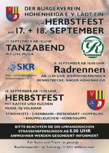 ab 15.00 Uhr: Beginn des Herbstfestes mit Kaffee und Kuchen, Kinderbelustigungen, DJ Volkmar und vielem mehr. Weitere Informationen erhalten Sie dann über unsere Aushänge, Flyer, die Homepage www.hohenheida.com oder über Facebook „Hohenheida und Nachbarn”.
